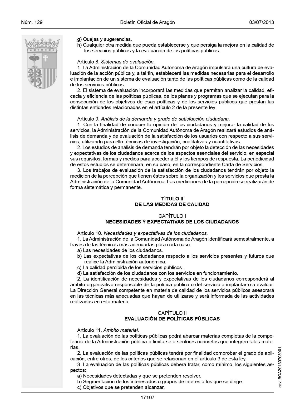 Artículos y Capítulos Ley 5/2013, de 20 de junio, de calidad de los Servicios Públicos de la Administración de la Comunidad Autónoma de Aragón